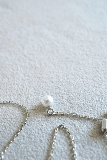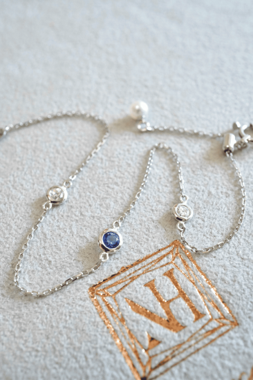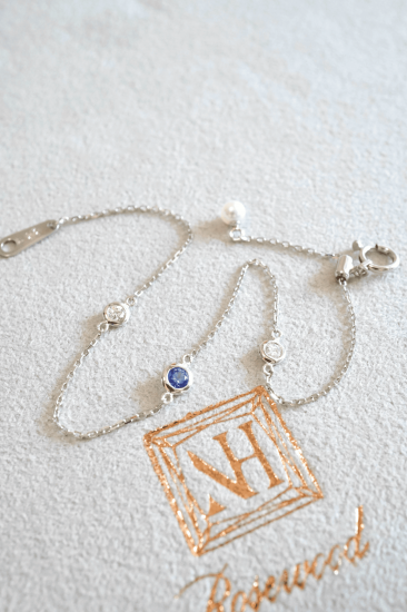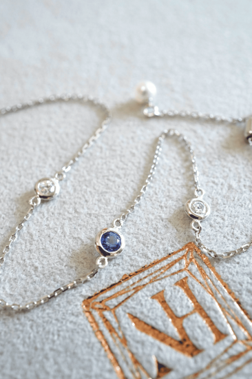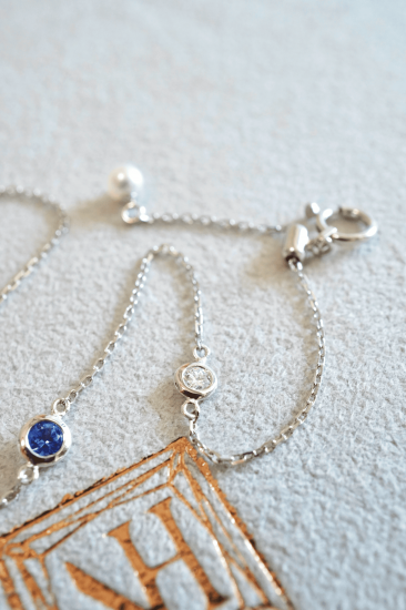 美しく深い青色が特徴のサファイアを用い、ベビーパールのお色味と溶け合うようなプラチナの相性が抜群のブレスレット。